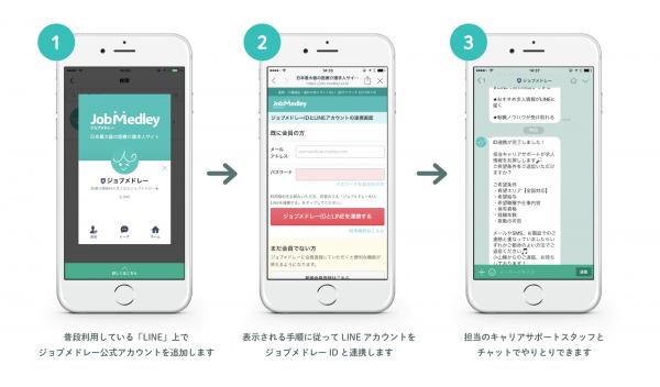求職者は、自身のLINEアカウントとジョブメドレーの会員情報を連携させることにより、LINEのトーク画面上で、登録した経歴や希望に沿った求人情報の受け取りや、キャリアサポートスタッフへのお問い合わせなどが可能になりました。(本機能の利用は無料です)