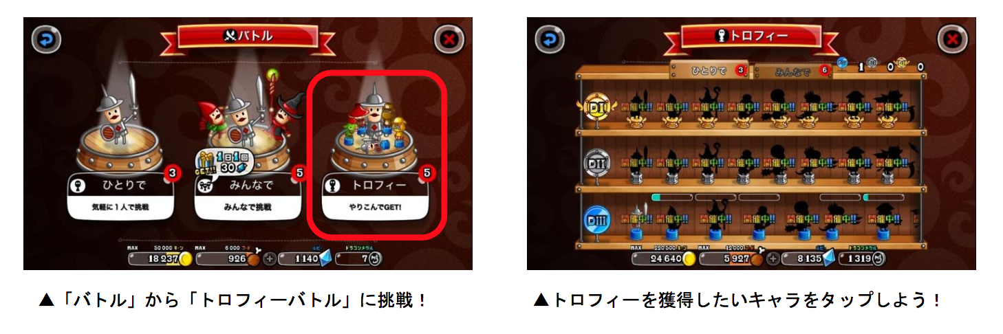 各キャラのトロフィーは、「トロP」を一定数貯めると獲得することができます。トロPは「キャラのLvが20以上」「うまP200以上」など、各キャラによって異なる条件を満たした状態でバトルを行なうと獲得できます。また、バトルを開始すると「ボーナスバトル」が発生することがあり、バトルの勝敗に関係なく、獲得トロPが2・3・5・10倍のうちいずれかの倍率で増加します。ボーナスバトルが発生したら、勝利してトロPの大量獲得を目指しましょう!