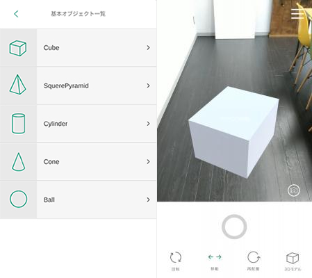 本アプリに収録されているCGは立方体、円柱、円錐、四角錐、球体の5種類で、全て高さや横幅などサイズを自由に変更することが可能です。その為置いてみたい家具や家電を正確なサイズ感で把握でき、メジャーなどでの採寸するなどの既存の方法に比べ、実際に設置を行うのと同様の感覚で、サイズ感や収まり具合を把握することができます。また、Tangoを利用することで、設置オブジェクトの誤差をmm単位まで抑えました。