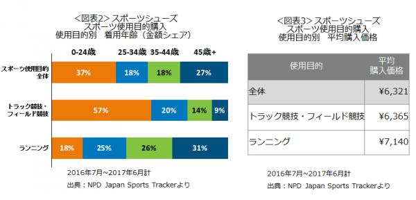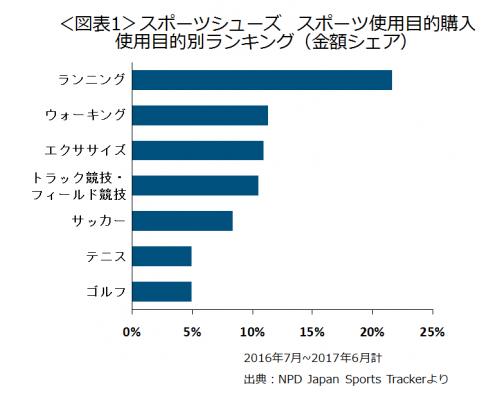 『Japan Sports Tracker*1』では、スポーツに使われている、またはスポーツ用に販売されているアパレルとシューズの消費者購入動向を継続して毎月調査をしています。 最新のデータで直近1年(2016年7月~2017年6月計 金額ベース)のスポーツシューズ市場をみてみると、スポーツ使用に購入したスポーツシューズの使用目的をみると(図表1)、トラック競技・フィールド競技の市場シェアは11%で、ランニング、ウォーキング、エクササイズに続く4位でした。トラック競技・フィールド競技の市場規模は370億円、成長率は前年比で5%でした。シェアはテニスやゴルフの2倍以上、サッカーよりも更に上位です。