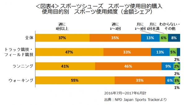 使用頻度をみると、トラック競技・フィールド競技使用では週3回以上の使用が47%でした(図表4)。全ての使用目的を合わせた合計では38%なので、トラック競技・フィールド競技使用の方が10ポイント高くなっています。週3回以上使用の比率が1番高かったのはウォーキングの55%でした。