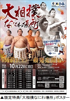 参加書店のうち、近畿エリアの約100書店では、10月22日(日)に行われる「平成29年秋巡業 大相撲なにわ場所」と連動し、地域限定プロモーションを行います。限定プロモーション参加店の店頭では「大相撲ジャーナル」フェアの告知パネルに加えて「なにわ場所」のポスターを掲出し、来店客に「なにわ場所」を告知します。また、10月22日~11月5日の期間に店頭で「なにわ場所」チケット半券を提示すると、当キャンペーン限定の「大相撲なにわ場所ポスター」をプレゼント。書店と「なにわ場所」の間で大相撲ファンの相互送客をはかります。