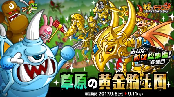 2017年9月5日(火)より、8週連続週替わり討伐イベント「みんなで討伐総集編!」の6週目となる「草原の黄金騎士団」を開催いたします。みんなで協力して「草原」マップに出現する敵を倒していきましょう!