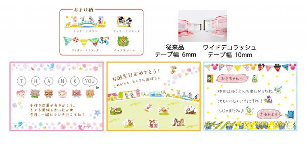 「ワイドデコラッシュ」は従来のテープ幅6mmより、さらに太い10mm幅。今まで表現するのが難しかった繊細な素材感やキャラクターの表情、動きを生き生きと表現できるようになりました。また、存在感もグレードアップしてデコレーションの幅が広がりました。