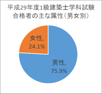 平成29年度1級建築士学科試験での「合格者の主な属性」を見ると、「男女別」では、「女性」が24.1%と過去最高の割合となりました。建設系の他資格においても、合格者における女性の割合は上昇しており、平成28年4月1日に施行された「女性活躍推進法」をはじめ、建設業界の女性の活躍推進に向けた国や業界団体、企業が展開する様々な取組みが実を結び始めていると推察されます。また、「受験資格別」における「大学」の割合が72.1%(平成28年度70.5% 前年度比+1.6%)となり、「年齢別」においては「24歳~26歳」の割合が23.9%(同年度22.2% 前年度比+1.7%)を記録しました。これらの結果から、建設業界における、若手業界人に対する取得要請はますます高くなり、大卒、大学院卒の方が受験資格を得てから、早い段階での資格取得することが主流になっていると推察されます。