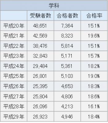 平成29年度の学科試験実受験者数は26,923名(平成28年度26,096名 前年度比+827名)、合格者数4,946名(同年度4,213名 同比+733名)、合格率18.4%(同年度16.1% 同比+2.3%)となり、各項目とも平成28年度を上回りました。