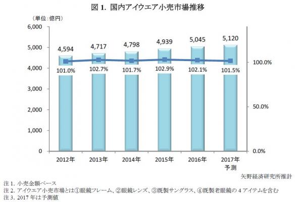 ◆2016年国内アイウエア小売市場規模は前年比102.1%の5,045億円、2017年は5,120億円を予測