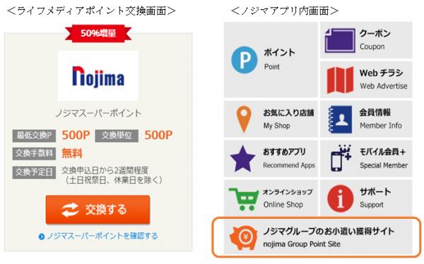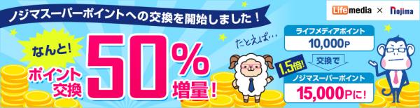 取り組み開始を記念しましてライフメディアポイントを50%増量してノジマスーパーポイントに交換となっています。