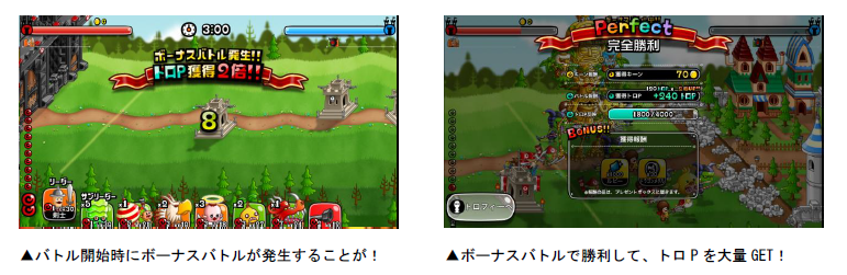 各キャラのトロフィーは、「トロP」を一定数貯めると獲得することができます。トロPは「キャラのLvが20以上」「うまP200以上」など、各キャラによって異なる条件を満たした状態でバトルを行なうと獲得できます。また、バトルを開始すると「ボーナスバトル」が発生することがあり、バトルの勝敗に関係なく、獲得トロPが2・3・5・10倍のうちいずれかの倍率で増加します。ボーナスバトルが発生したら、勝利してトロPの大量獲得を目指しましょう!