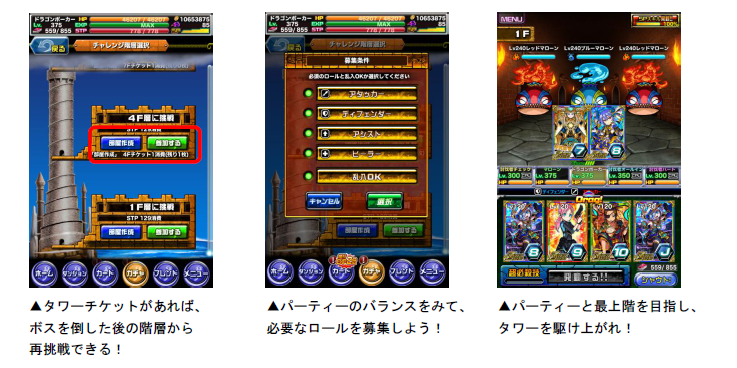 タワーダンジョンには「部屋作成」または、部屋に「参加する」を選択して挑みます。部屋を作成する場合、パーティーに入って欲しいロール(役割)を選択して、メンバーを募集することができます。ロールの異なるメンバーで役割分担しながら、ボスに挑んでみましょう!また、4階層以上で部屋を作成する場合、一定階層ごとに出現するボスを倒した際に手に入る「タワーチケット」を1枚消費することで、ゲームオーバーや中断した場合でも、チケットを手に入れた階層から挑戦できます。