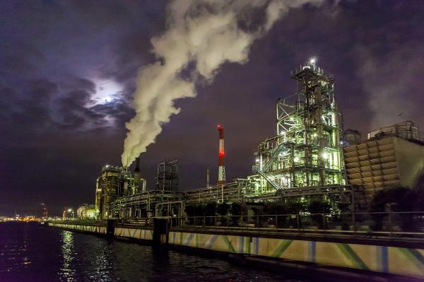 日本初の「工場夜景ジャングルクルーズ」により海上から望む川崎プラント群と月。