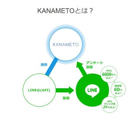 「KANAMETO」は、トランスコスモス株式会社(本社:東京都渋谷区、代表取締役社長兼COO:奥田昌孝、証券コード:9715)と、LINE株式会社(本社:東京都新宿区、代表取締役社長:出澤剛)の共同出資会社である、transcosmos online communications株式会社(本社:東京都渋谷区、代表取締役社長:貝塚洋)が開発したLINE@対応メッセージ配信ツールです。