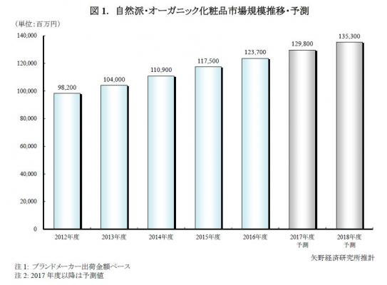 ◆2017年度の自然派・オーガニック化粧品市場は前年度比4.9%増の1,298億円、