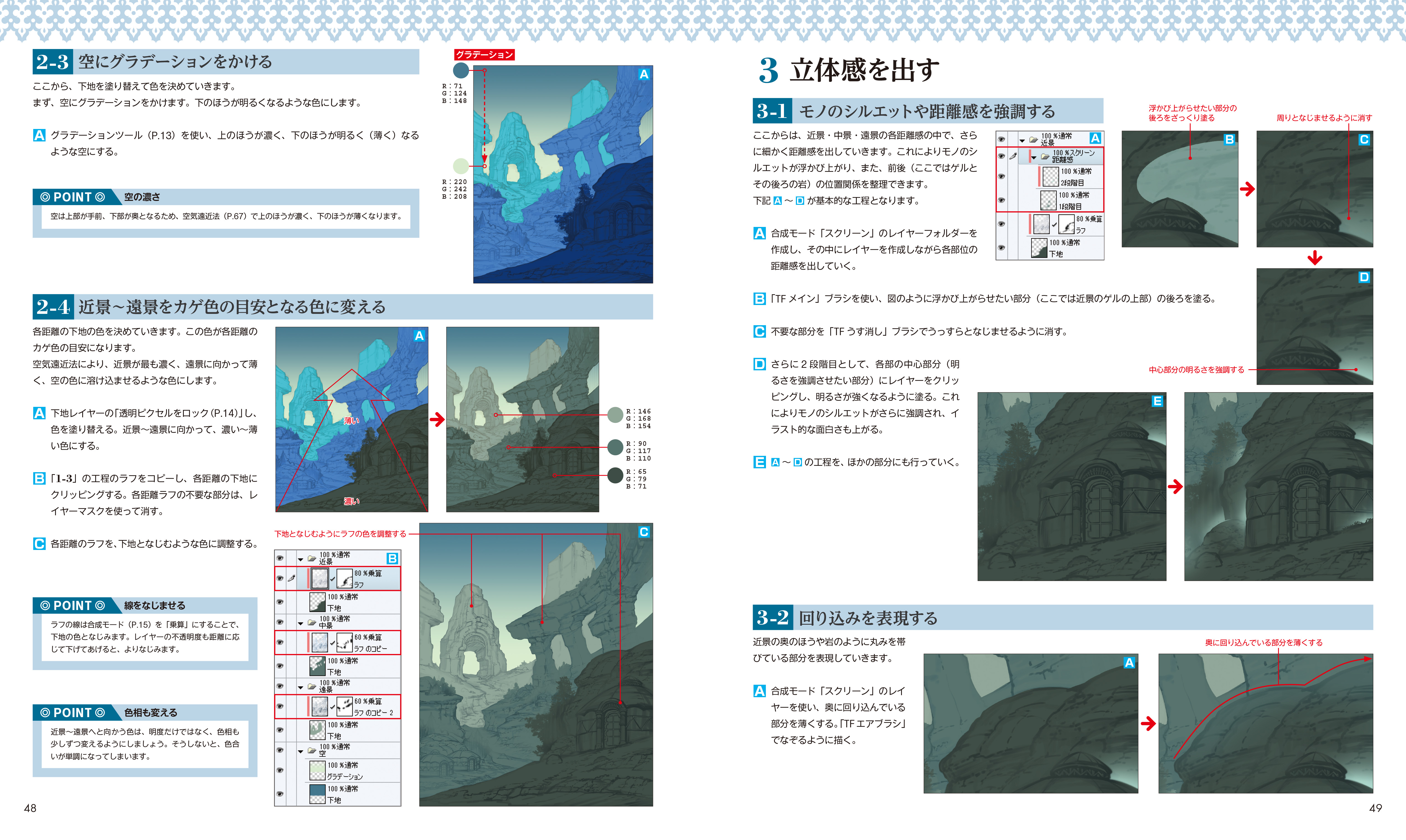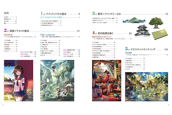 後半では、東洋と呼ばれる国をモチーフとした風景イラストのメイキングを掲載。どのイラストも前半で学んだ「CLIP STUDIO PAINTの使い方」「風景イラストの描き方」の基礎をベースにし、それを応用しながら描いていきます。イラス