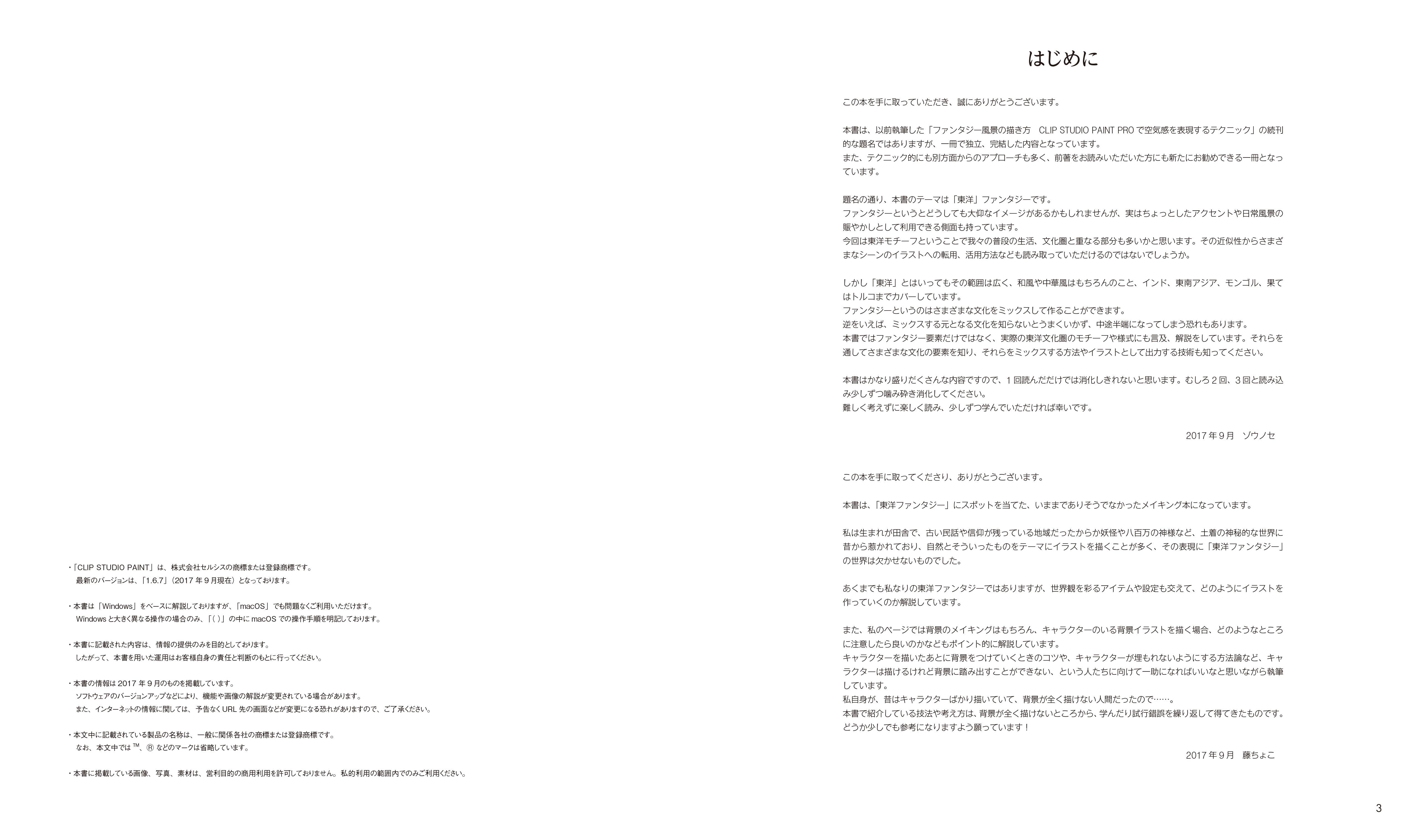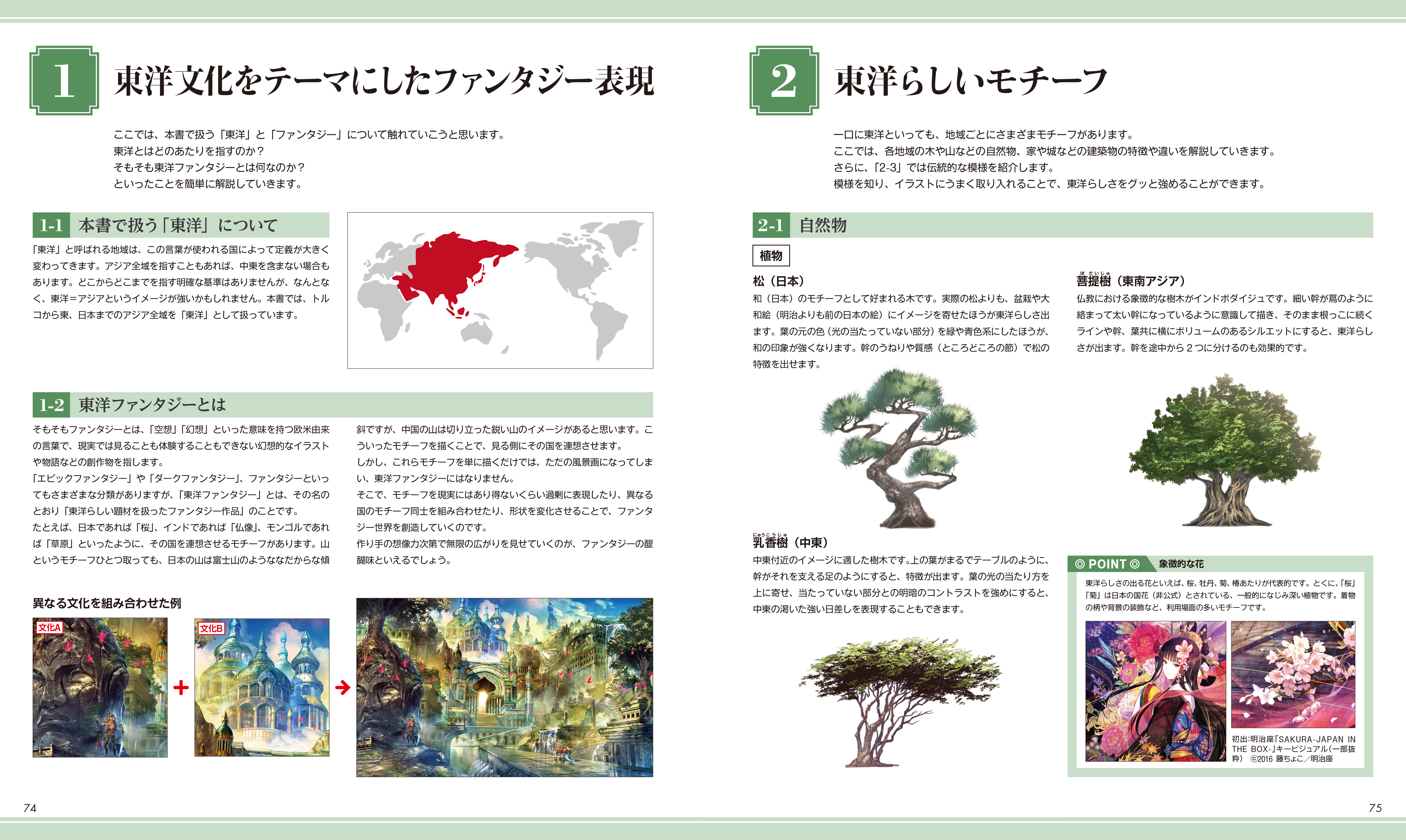 トごとに学ぶべき重要なポイントを用意し、著者の持つ厳選されたテクニックを解説します。さらに、著者のゾウノセ、藤ちょこ、二人の視点から、「東洋らしい世界」の構築の仕方を余すところなく披露します。