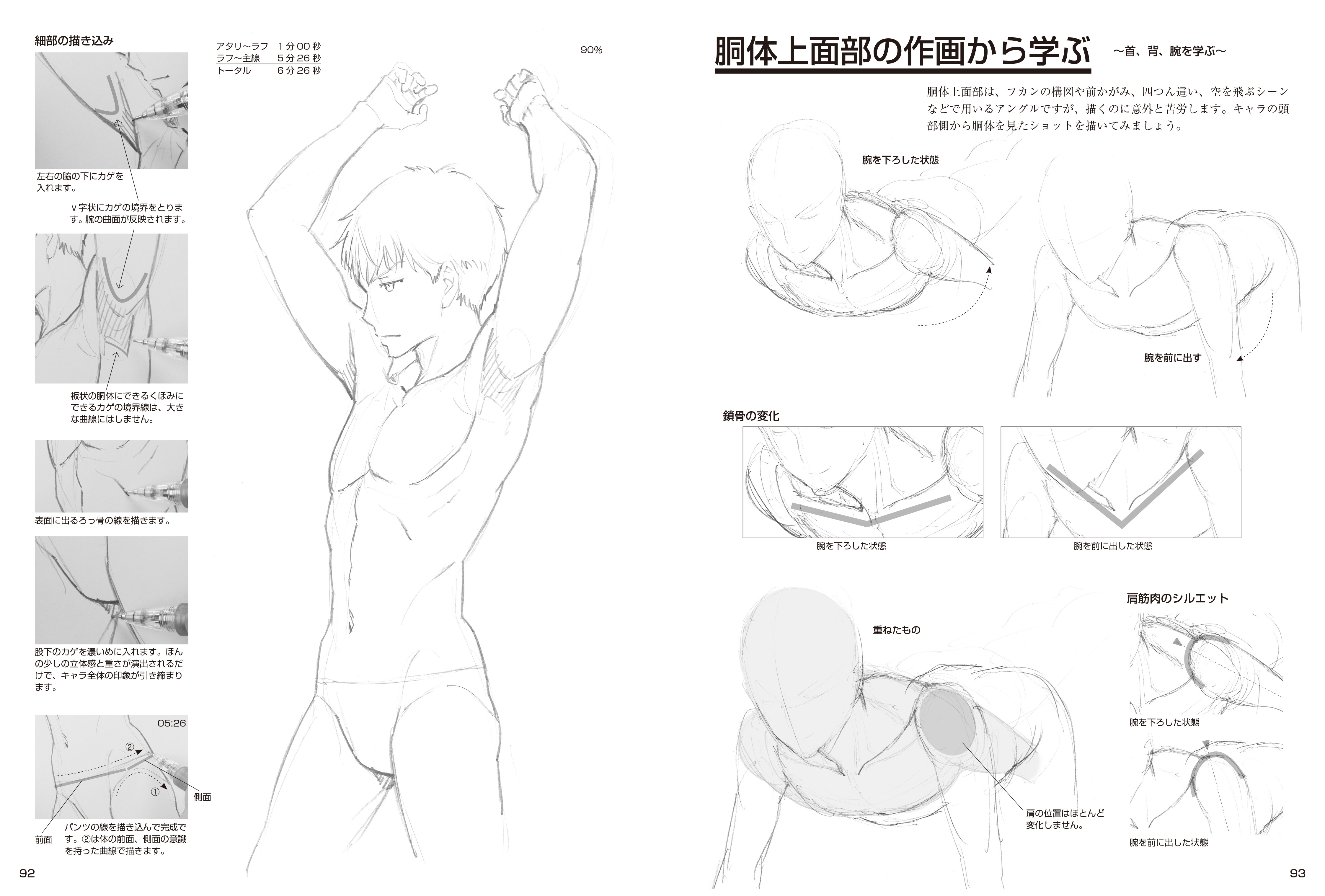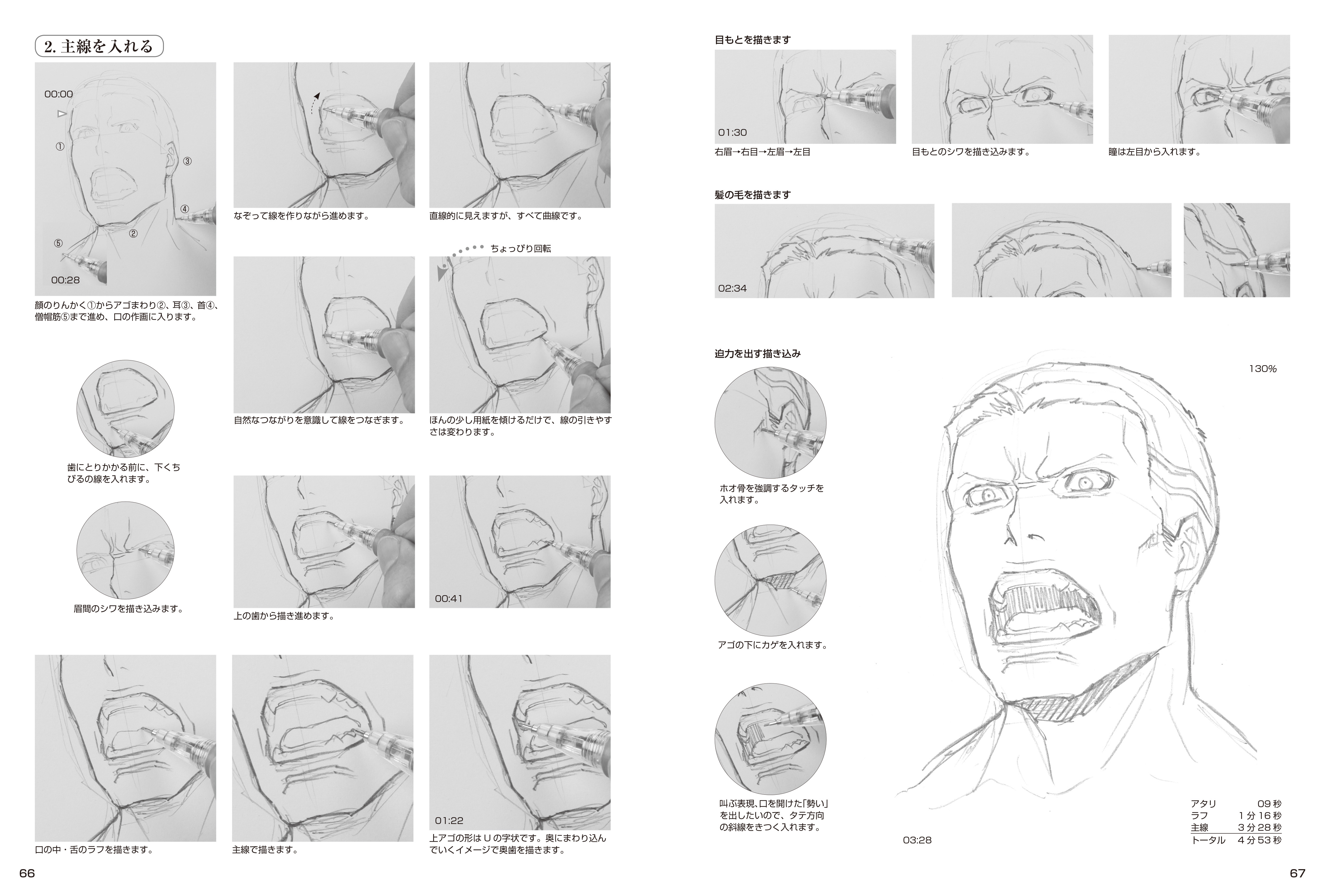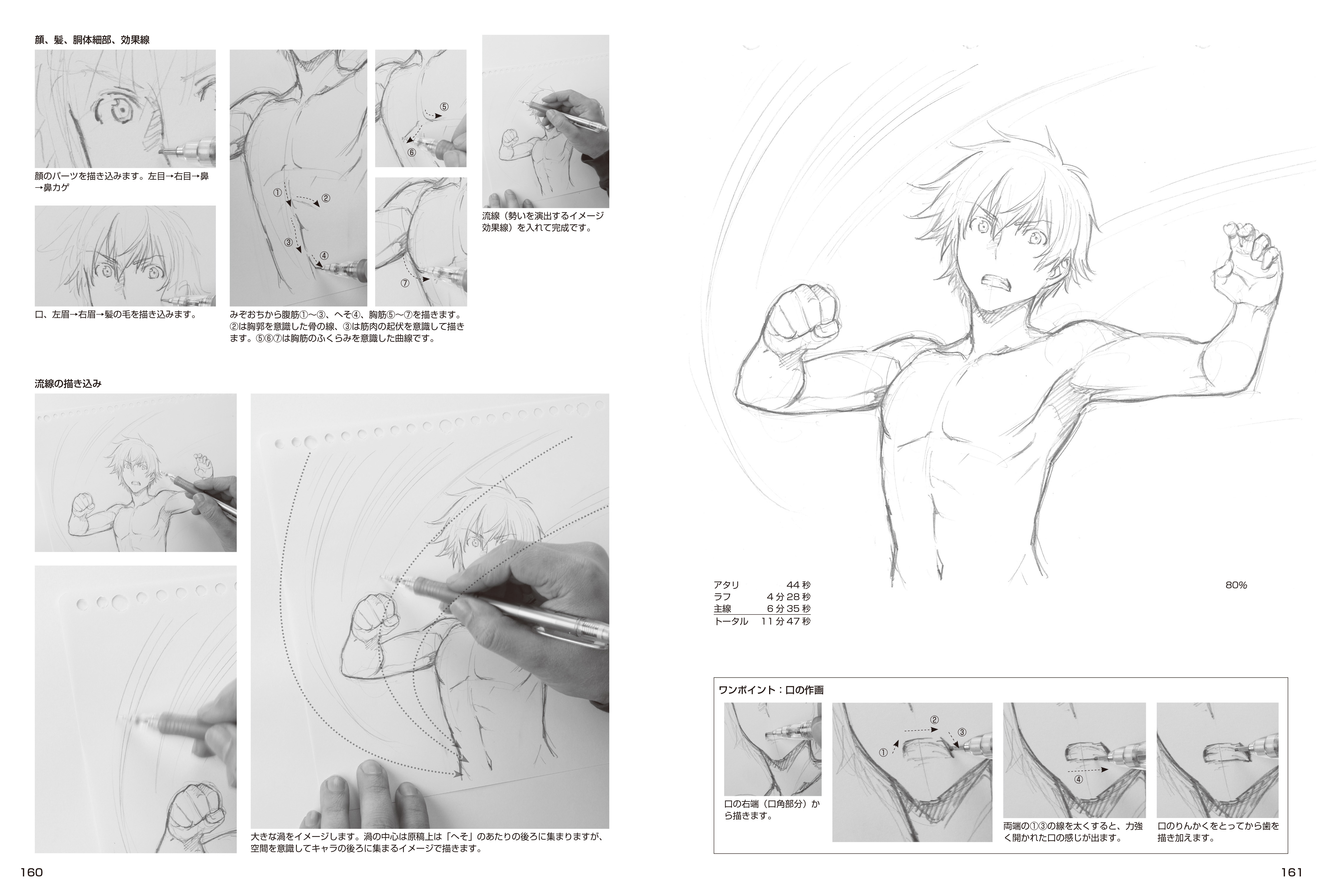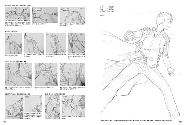 第1章ではキャラデザ、第2章では体の構造を学ぶハダカデッサン、そして第3章では動きの作画を学びますが、重要なことは、森田プロがどこに気を使って描いているか、何を大切にしているか、絵に対する姿勢や線に対する意識を、刻一刻と変化する本書の画面から見て学び取ってください。