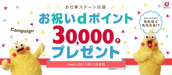 dジョブサービススタートを記念して、9月27日から11月30日までに応募条件をすべて満たした方に3万dポイント(期間限定ポイントとなります。)を進呈するキャンペーンを実施いたします。
