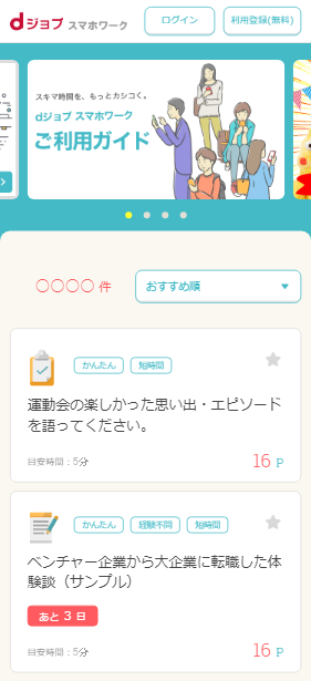dジョブに掲載される仕事情報は「求人情報」と「スマホワーク」と2つのカテゴリにわかれており、ドコモユーザーでなくても利用が可能です。