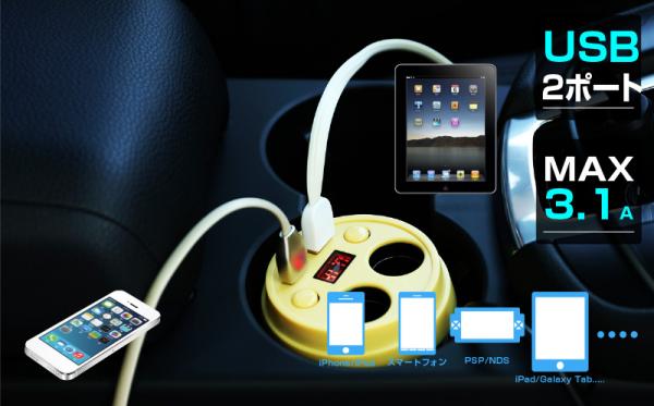 2ポートUSB出力でスマホやiPhone,iPadを充電できる。