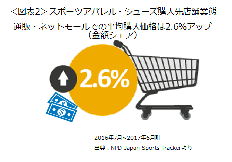 スポーツアパレル・シューズの平均購入価格をみると、通販・ネットモールでの購入では前年同期比2.6%上昇しました(図表2)。通販・ネットモールを除いた購入先店舗業態合計では1.3%上昇で、通販・ネットモールでは2倍の上昇だったことがわかります(特典データ)。