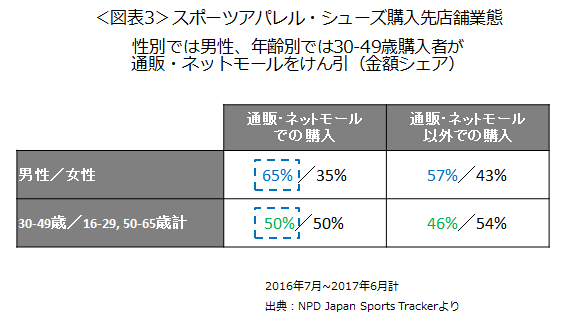 本分析では、2016年7月~2017年6月計のスポーツアパレル・シューズの購入についても通販・ネットモール(楽天、Amazonなどのオンラインモール、通販専門店。ブランドやスポーツ用品店のウェブサイトからの購入は除く)での購入が前年同期比21%増と大きく成長していたことがわかりました。