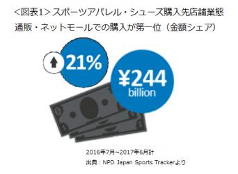 『Japan Sports Tracker※1』では、スポーツに使われている、またはスポーツ用に販売されているアパレルとシューズの消費者購入動向を継続して毎月調査をしています。直近1年(2016年7月~2017年6月計 金額ベース)のスポーツシューズ・アパレル市場規模は1兆560億円で前年同期比4%増です。購入場所は通販・ネットモールが前年同期でトップだったスポーツ用品店を抜いて1位となりました。通販・ネットモール購入の市場規模は2440億円で、成長率は市場全体の成長率を大きく上回る前年同期比21%でした(図表1)。