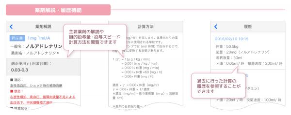 医療従事者は、患者の体重・薬量・希釈液量などの必要な情報を入力するだけの簡単な操作で、ガンマ値から投与速度を算出できるようになります。また、主要薬剤の解説や、過去に行った計算の履歴閲覧機能も備えています。