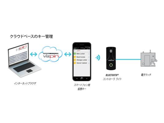 ■画像:VIZpin(R) セキュリティ用ウェブポータルを用い仮想アクセスキーを発行し、電子ロック(ラッチ)の遠隔管理制御やアクセス監視を行う
