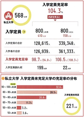 入学定員充足率は、入学定員800人未満の大学は98.7%に対し、入学定員800人以上の大学は106.5%。入学定員割れ校は、入学定員800人未満の大学は199校に対し、入学定員800人以上の大学は22校となり、小規模校大学が苦戦していることがうかがえます。