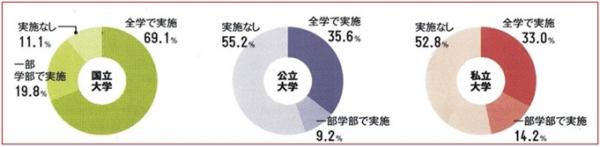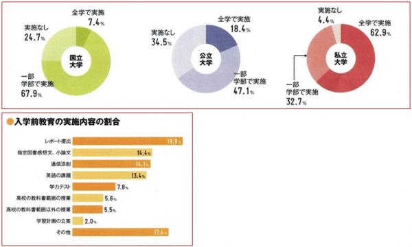 入学前教育は、大学入学前の期間に、入学予定者を対象に課題やテスト、授業等を行う制度です。今回の調査では、国立大学の7.4%、公立大学の18.4%、私立大学の62.9%が全学で実施しているという結果となり、特に私立大学で積極的に行われていることがわかりました。