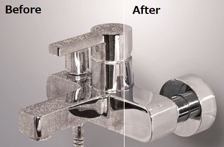 お風呂場の蛇口やシャワーヘッドなどに現れる白い水滴のような頑固な“カルキ汚れ”。これは水の中に溶けていたカルシウムが原因です。水が蒸発を積み重ねることで白い水垢が発生し、気づかないうちに一目で分かる程、汚れが目立ってしまいます。“カルキ汚れ”は、洗剤などで擦ると落ちる汚れと、洗剤でも落ちない頑固な汚れの2種類でできています。洗剤でも落ちない汚れは、リフォーム業者でも硬い鉱物で削るか、危険な酸であるフッ酸で汚れを溶解して落とすしかなく、一般の家庭で実践するのは非常に難しい方法です。