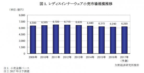 ◆2016年のレディスインナーウェア小売市場は前年比98.8%の6,240億円、