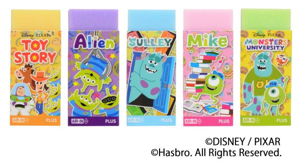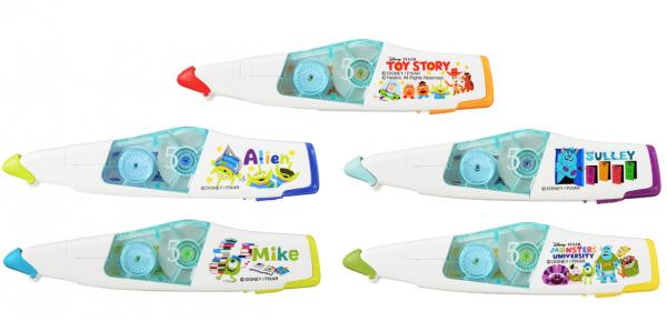 デザインは2製品共通、「トイ・ストーリー」、「エイリアン」、「サリー」、「マイク」、「モンスターズ・ユニバーシティ」の全5種類。メーカー希望小売価格(税抜)は、修正テープ「ホワイパーPT」が300円(交換テープは定番品と共通で130円)、消しゴム「エアイン」は130円です。