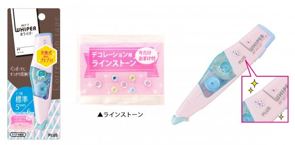 抜群の使い心地とおしゃれなパステルカラーが女子中高生に大人気! 筆記具感覚で使えるペンタイプの修正テープ「ホワイパーPT」の定番カラーには、「ホワイパー」シリーズ発売25周年を記念して、11月1日出荷開始分から数量限定でデコレーション用ラインストーンを付属します。淡い色合いのラインストーンが本体カラーとマッチする特別仕様!本体の好きな場所に貼って、自分だけの「ホワイパーPT」を作っちゃおう♪ ラインストーンはピンクが3粒、ブルー・グリーンがそれぞれ2粒の合計7粒入り。メーカー希望小売価格は通常品と同じ200円(税込)です。