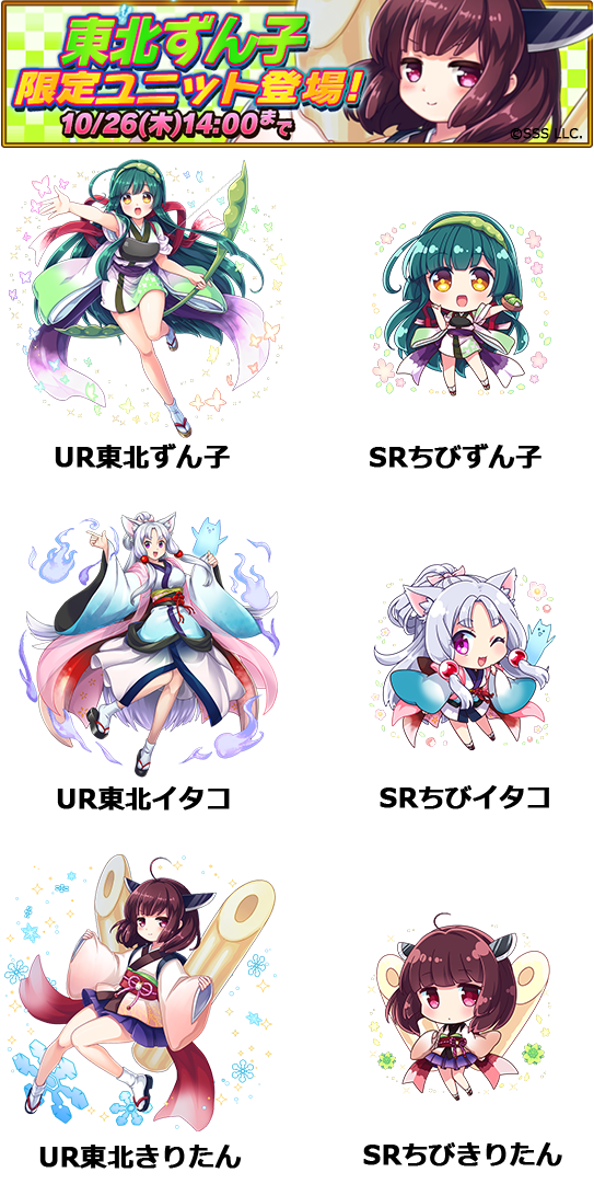 さらにコラボ限定SRとして二頭身へとデフォルメされた、「ちびずん子」(CV:佐藤聡美)、「ちびイタコ」(CV:木戸衣吹)、「ちびきりたん」(CV:茜屋日海夏)も登場!