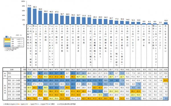 全体では「お正月におせち・雑煮など正月料理を食べる」73.8%が最も高く、「大晦日に年越しそばを食べる」68.3%、「クリスマス」59.5%と続く。10月に控えている「ハロウィン」は全体では12.2%にとどまっているが、性年代別にみると、女性20~34歳は26.0%と全体より10pt以上高く、女性35~49歳も20.0%と全体より5pt以上高い。50~69歳は「大晦日に年越しそばを食べる」「お盆の墓参り」「お歳暮を贈りあう」「お中元を贈りあう」が男性・女性共に全体より10pt以上高く、年代差がみられる行事であった。