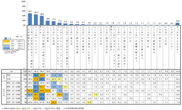 全体では「お正月におせち・雑煮など正月料理を食べる」50.7%が最も高く、「クリスマス」46.2%、「大晦日に年越しそばを食べる」39.6%と続く。性別でみると、男性は「お正月におせち・雑煮など正月料理を食べる」55.3%が最も高く、「大晦日に年越しそばを食べる」50.6%、「クリスマス」33.3%と続く。一方女性は「クリスマス」57.9%が最も高く、「お正月におせち・雑煮など正月料理を食べる」46.4%、「大晦日に年越しそばを食べる」29.6%と続く。男性と女性では、「クリスマス」と「大晦日に年越しそばを食べる」において、それぞれ20pt以上の差がみられた。