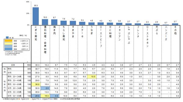 全体では「にぎり寿司」30.3%が最も高く、「懐石料理・会席料理」10.2%、「焼き肉」9.7%、「ちらし寿司」7.5%、「すきやき」7.2%と続く。上位5つのうち、「にぎり寿司」「懐石料理・会席料理」「ちらし寿司」と和食への人気が高い結果となり、以上3つの計は48.0%と約半数となる。「にぎり寿司」は各性年代とも最も高い値であったが、「懐石料理・会席料理」「焼肉」は性年代ごとに人気を二分する結果であった。男性20~34歳・男性35~49歳・女性20~34歳は「焼肉」の人気が高く、男性50~69歳・女性35~49歳・女性50~69歳は「懐石料理・会席料理」の人気が高かった。