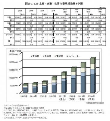 スマートフォンなどの情報通信機器の電源やEV、PHEV等の動力源として搭載されるリチウムイオン電池は、十数点以上の部材点数及び材料から構成されるが、本調査では、正極材、負極材、電解液(電解質)、セパレーターの主要4部材を対象とする。なお、本調査結果は全て米ドルベースで算出しており、2013年は1USD=97.8円、1116.97ウォン、6.16元、0.75EUR、2014年は1USD=105.9円、1152.93ウォン、6.14元、0.75EUR、2015年は1USD=121.0円、1129.94ウォン、6.23元、0.90EUR、2016年以降は1USD=108.8円、1207.70ウォン、6.64元、0.94EURで換算した。
