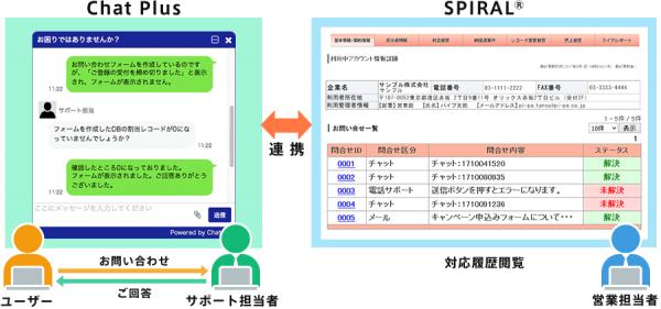 本システム連携では、「ChatPlus」のチャット履歴を「スパイラル(R)」で構築した顧客管理システムに自動登録することで、チャット担当部門から営業担当への円滑な情報共有を実現します。