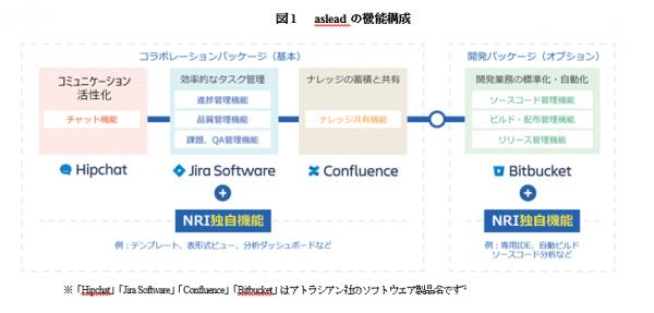 「aslead」は、全世界で90,000社以上の幅広い業種の企業において使用されているアトラシアン社*2が提供するソフトウエア製品群と、NRIが過去10年間に400以上の大規模システム開発プロジェクトでの培った経験やノウハウをもとに、新たに開発した業務テンプレートを始めとするNRI独自機能を組み合わせ、【コラボレーションパッケージ】と【開発パッケージ】の2つで構成しています(図1)。