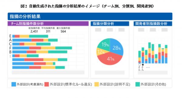 「aslead」は、設計工程におけるレビュアから設計者への「設計考慮不足」といった指摘状況の見える化と、それに伴う起票作業に関する負荷の軽減する機能を提供します。具体的には、プロジェクト管理者やスタッフが毎日、品質分析や品質評価ができるようにするために、日々発生する大量の指摘事項について、議事録等から容易に書面化(起票)する機能を備えています。このように、指摘事項を集約・集計して「見える化」することで、早期に対策を実施することによる品質の向上を実現させます(図2)。