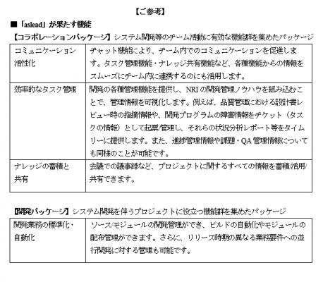 株式会社野村総合研究所(本社:東京都千代田区、代表取締役社長:此本 臣吾、以下「NRI」)は、大規模な情報システムを開発するプロジェクトにおいて、成果物の品質向上と業務効率化の双方をサポートする開発管理統合サービス「aslead(アスリード)」*1の提供を、本日から開始します。「aslead」を導入することで、プロジェクトの全体状況の把握が容易になり、効率的なマネジメントの推進などが実現できます。また、システム開発に携わるプロジェクトのメンバー間での情報共有が円滑になることで、コミュニケーションが活性化し、コラボレーションが強化されます。