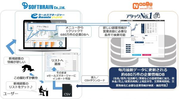 データ・リストの販売、調査代行の株式会社ナビット(東京都千代田区、代表取締役 福井泰代、以下、ナビット)と、営業課題解決サービスを提供するソフトブレーン株式会社(東京都中央区、代表取締役社長 豊田浩文、以下、ソフトブレーン)は、企業情報データベースの「アタックNo.1」と使い勝手No.1(*)の営業支援システム(CRM/SFA)「eセールスマネージャーRemix Cloud(以下eセールスマネージャー)」の連携が完了し、本日から提供開始することを発表いたします。