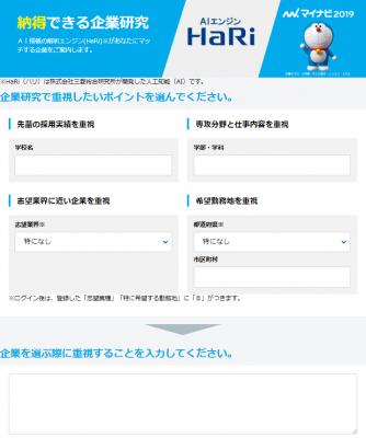 MRIが人材領域に特化して開発したHR(人事)Tech AIエンジン「HaRi」に、マイナビが保有するデータを活用して学生の希望に合う企業を検索し本人との適合度を提示するサービスです。