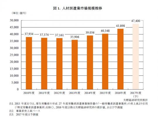 本調査における人材ビジネス市場とは、一般労働者派遣業(人材派遣業)、人材紹介業、再就職支援業、技術者派遣ビジネス、営業・販売支援人材ビジネス、求人情報サービス、製造派遣・請負ビジネス、医療人材サービスの8分野を対象とするが、ここでは調査対象のうち、一般労働者派遣業(人材派遣業)、人材紹介業、技術者派遣ビジネスの3分野を取り上げ、分析する。なお、「人材派遣業」の2015年度実績値までは厚生労働省の平成27年度労働者派遣事業報告書のうち、「一般労働者派遣事業」の売上高より引用している。
