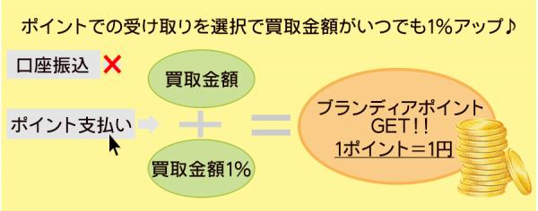 ブランディアポイントは宅配買取サービス利用時において貯めることができます。買取金額の受け取り方法に「ポイント」を選択すると、買取金額と一緒に毎回1%のボーナスポイントを受け取ることができます。貯まったポイントは1ポイント=1円としてブランディアオークションでご利用いただくことが可能です。