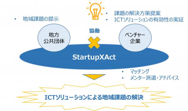 従来、地方公共団体が抱える課題の解決には、国による実証事業や補助事業の実施という形で政策が進められてきましたが、地域にはまだ解決されていない固有の課題が存在します。「StartupXAct」は、ICT等の新しい技術やそれを利用したビジネスモデルを持つベンチャー企業の活用に重点を置き、解決策をスピーディーに提供し得る新しい政策手法です。