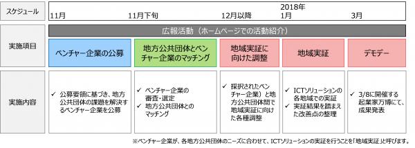 ベンチャー企業の公募期間は、2017年11月2日(木)~11月27日(月)です。ベンチャー企業の有するICTソリューションの実証成果は、総務省およびNICT(国立研究開発法人情報通信研究機構)主催の起業家万博の場で、「デモデー」とする2018年3月8日に公表します。