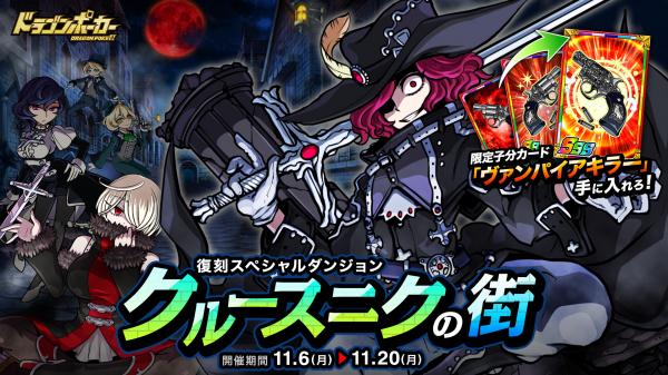 11月6日(月)より、復刻スペシャルダンジョン「クルースニクの街」を開催いたします。今回のダンジョンでは、限定子分カードや新たな敵が追加されます。前回の開催期間中に『ドラゴンポーカー』をまだプレイしていなかった方や、限定カードを入手できなかった方も、復刻開催する本ダンジョンをお楽しみください。